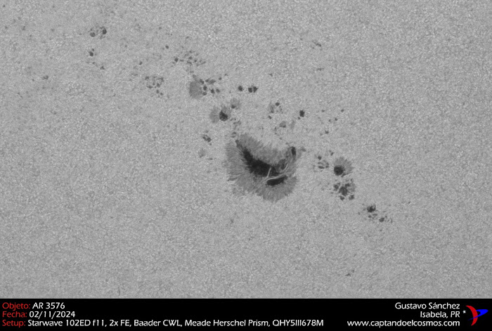 Hoy desde, Puerto Rico, se puede observar una impresionante mancha solar conocida como AR3576 y fue fotografiada por Juan González Alicea, presidente Asociación de Observación, Difusión Astronómica y Ciencias del Espacio (AODACE) a través del telescopio SeeStar50. Esta mancha, de dimensiones colosales, podría incluso ser visible a simple vista con gafas solares certificadas para ver eclipses. De hecho, su tamaño es tan asombroso que la Tierra podría caber en ella hasta 15 veces.